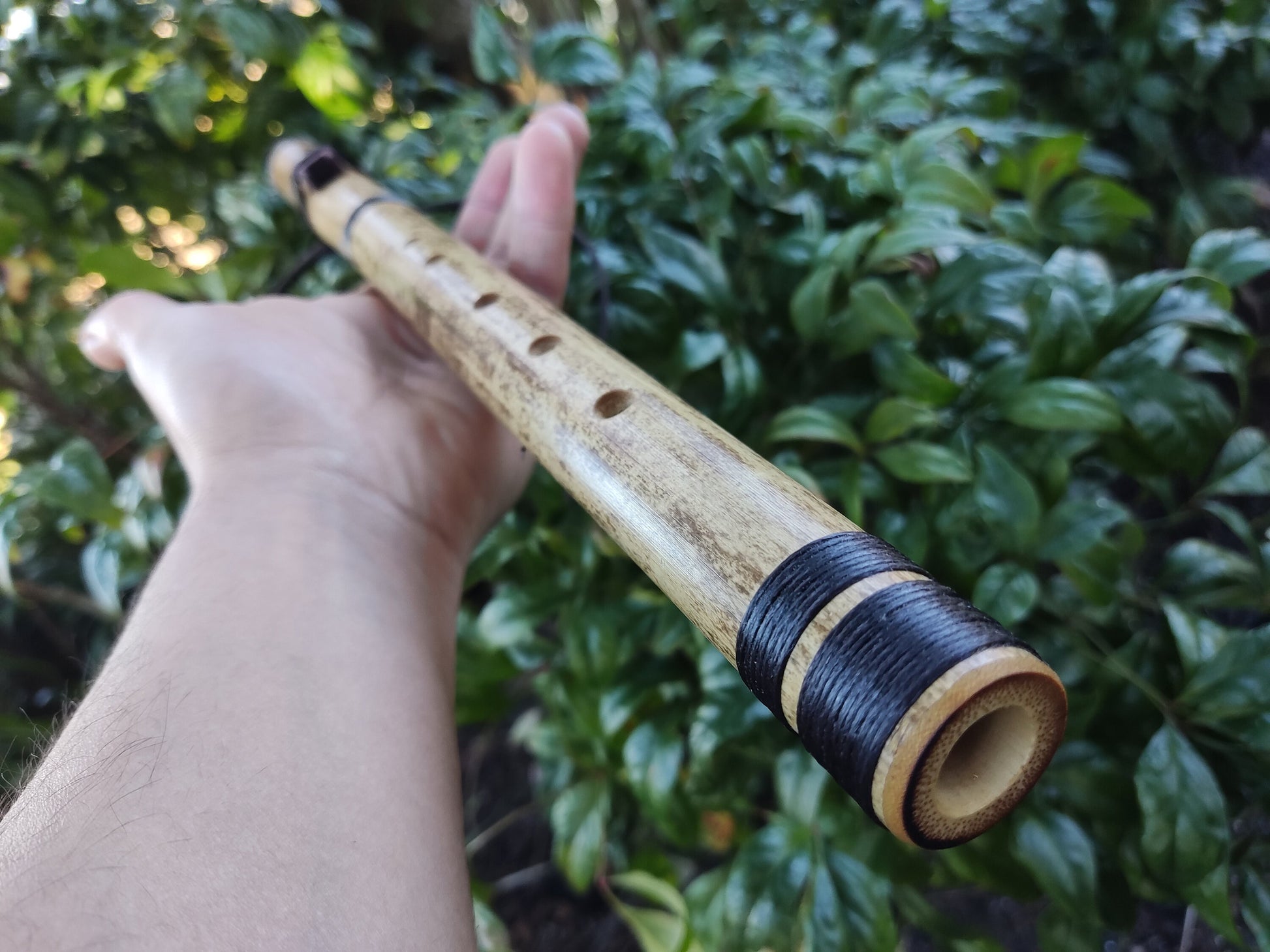 It is tuned in the key of A, with an oriental look. It has five holes, comprising the normal minor pentatonic scale and will play loudly and clearly.